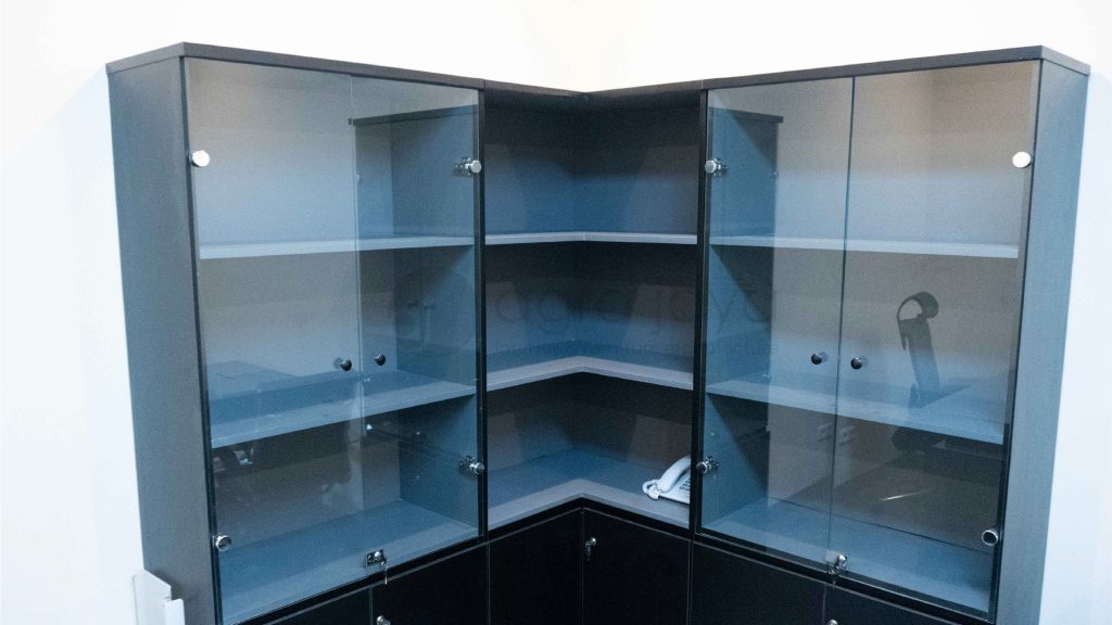 4. Display Cabinet Lemari dengan pintu kaca yang digunakan untuk memamerkan barang-barang koleksi, seperti perhiasan, barang antik, atau hiasan.